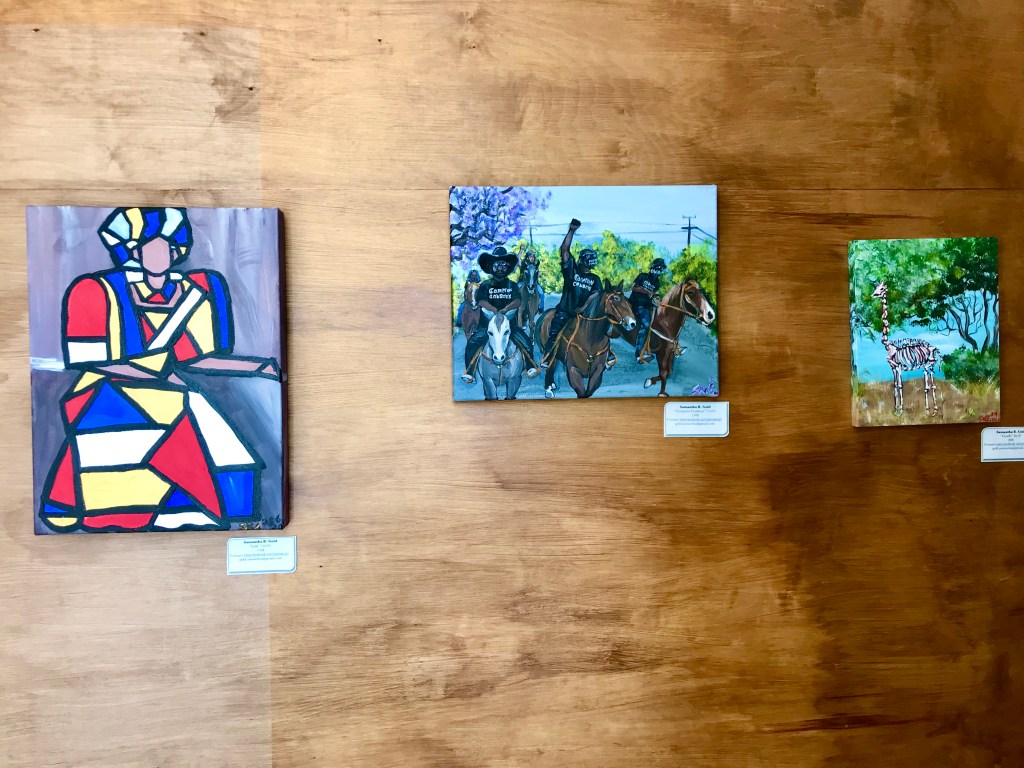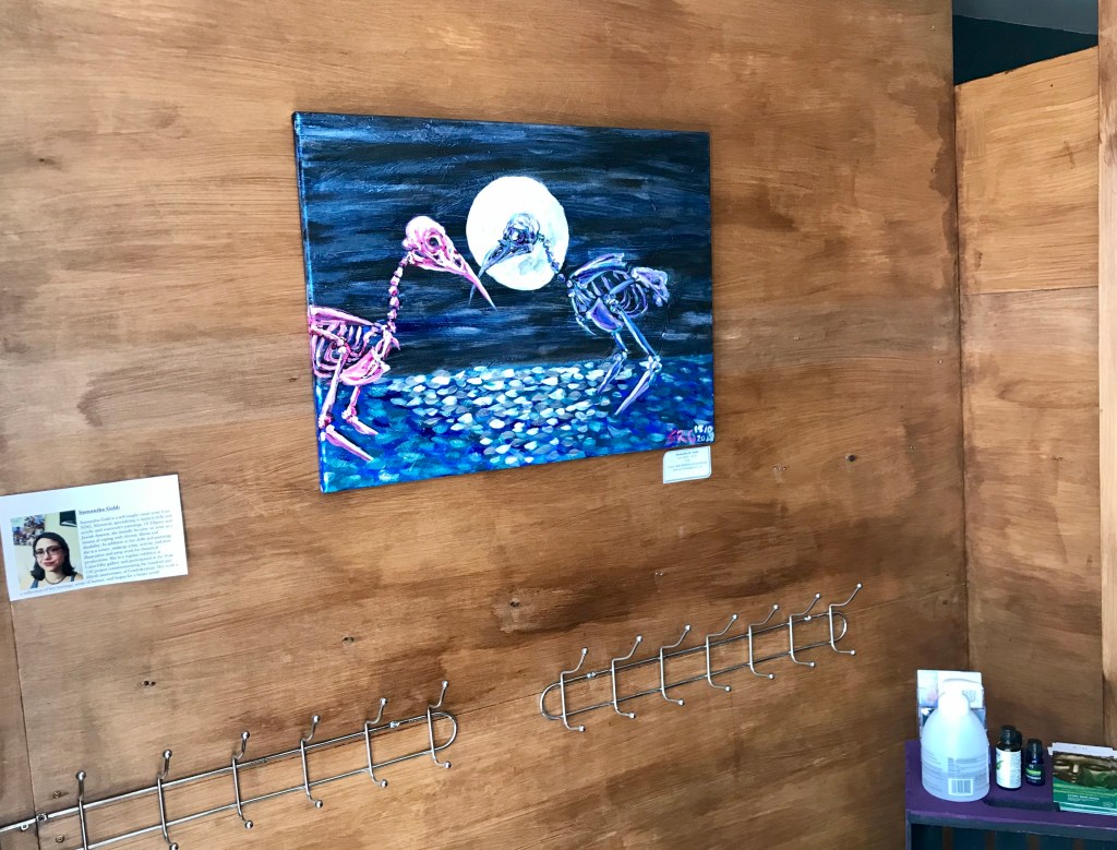 Studio MoFitness has officially opened and while we are still mainly operating in the park, we are starting to use the studio more and more. As a way to make our studio feel like a 2nd home and to connect to our community, we decided to reach out to local NDG artists to show their artwork in our entrance. For the months of August and September, when you arrive at Studio MoFitness, you will be greeted with the colourful and inspiring paintings of Samantha Gold. Below are a few photos of her work in our space as well as her artist bio. If you are interested in purchasing her work or finding out more about the artist, just get in touch with Samantha (contact info below).